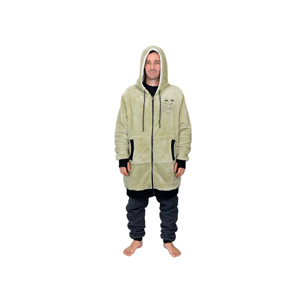 Comme un sweat à capuche : manches longues avec ouvertures pour les pouces, capuche doublée et ajustable avec liens, grand poche kangourou sur le devant.