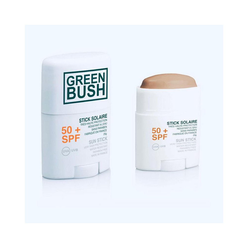 GREENBUSH STICK SOLAIRE, indice de protection 50+ UVA et UVB, haute protection, résistant à l'eau, fabriqué en France, formule naturelle.